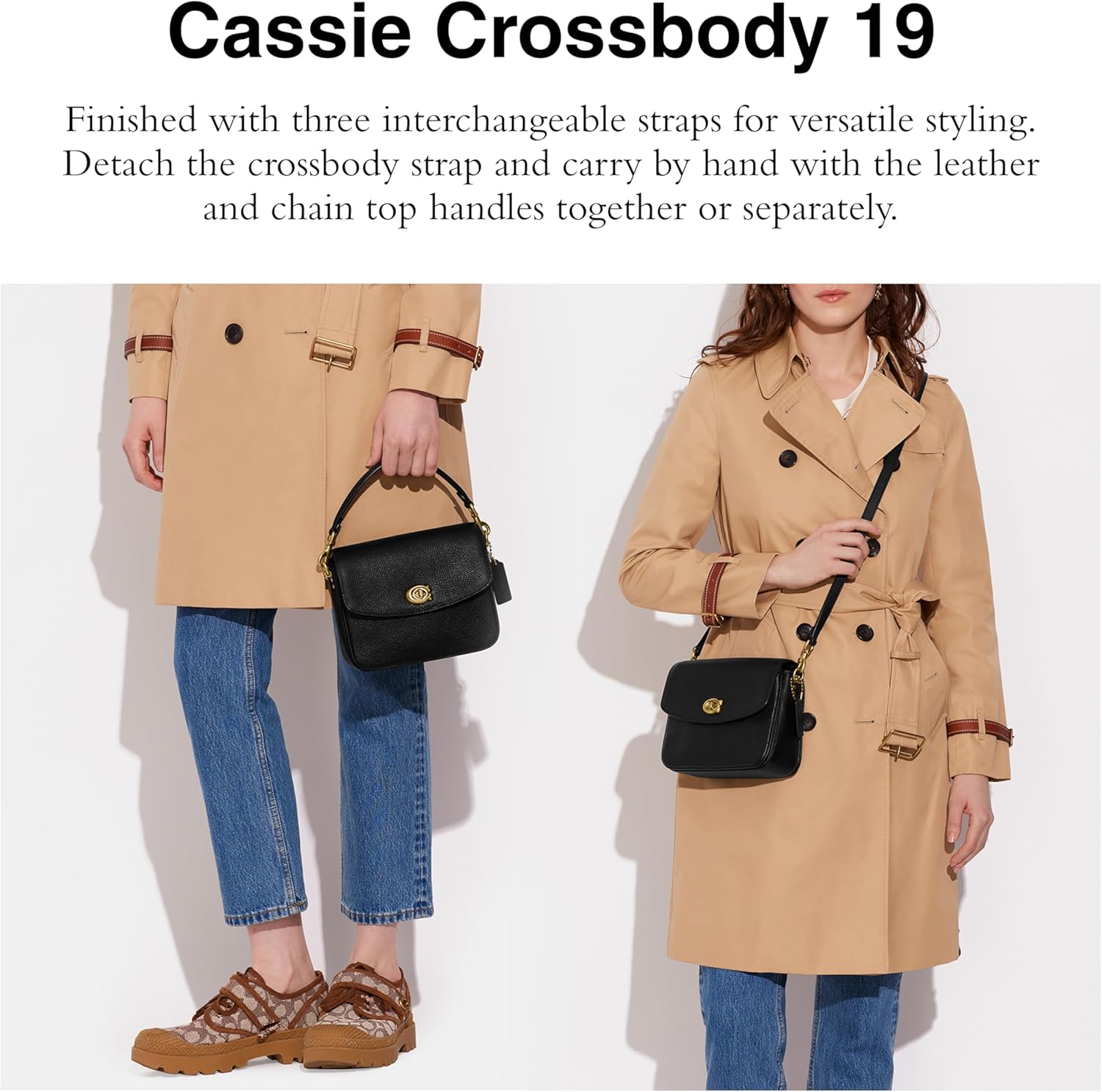 La borsa include tre cinghie intercambiabili: una tracolla corta staccabile con caduta di 10,2 cm, una tracolla a catena staccabile di 22,9 cm e la possibilità di utilizzare le maniglie superiori in pelle. Questo permette di portare la borsa in tre modi diversi secondo le preferenze personali.