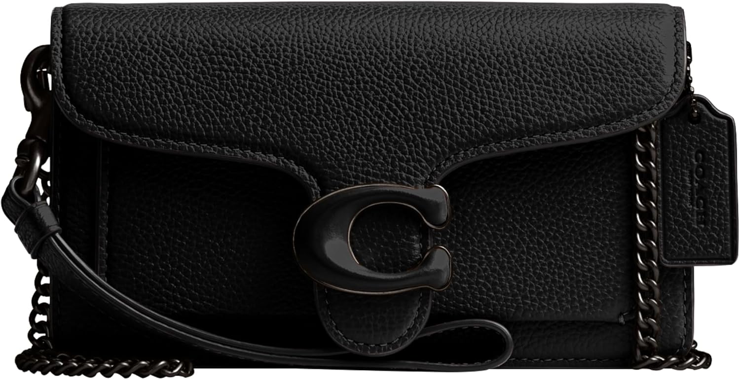 La pochette COACH Polished Pebble Tabby Wristlet in nero si distingue per il design elegante e i materiali di alta qualità. Realizzata con pelle lavorata per un effetto morbido e lucido, include una tracolla regolabile per un portamento versatile. La finitura dettagliata e il logo COACH in rilievo aggiungono un tocco di raffinatezza, rendendola un accessorio affidabile e alla moda.